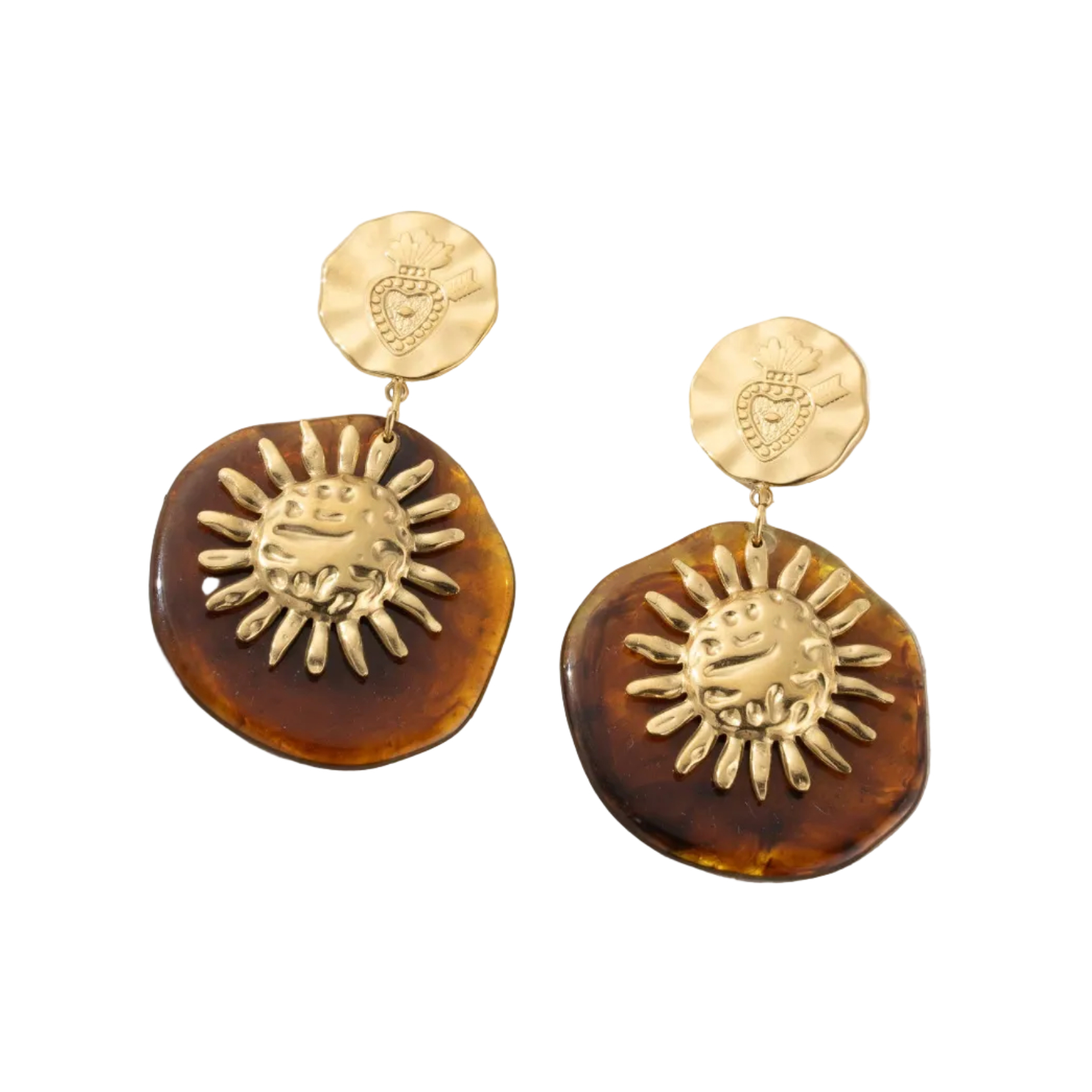 Deze oorbellen van amberkleurige hars en goudkleurig metaal vallen op door hun krachtige symbolen: een fijn gegraveerd hart en een stralende zon in een medaillon. Het design geeft je look direct karakter en elegantie. Licht en comfortabel om te dragen, perfect voor zowel een boho/Western-stijl als een meer geklede outfit. Een trendy en mystiek sieraad dat een unieke en vrouwelijke uitstraling geeft.