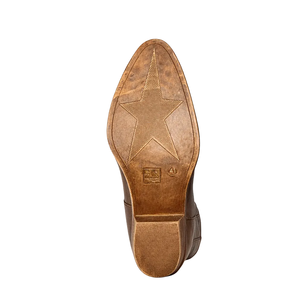 Yeeha! Cowboylaarzen zijn niet meer weg te denken uit je garderobe. Deze bruine western laarzen zijn perfect te combineren met een jurkje, een lange rok of een stoere jeans voor een echte western look. De laarzen hebben een stoere uitstraling en op de zool staat een ster, wat zorgt voor een unieke en speelse western touch. Het voetbed is niet uitneembaar. De schachthoogte is circa 24cm en de hak is circa 4cm. Dit zorgt voor een comfortabele en stijlvolle pasvorm.