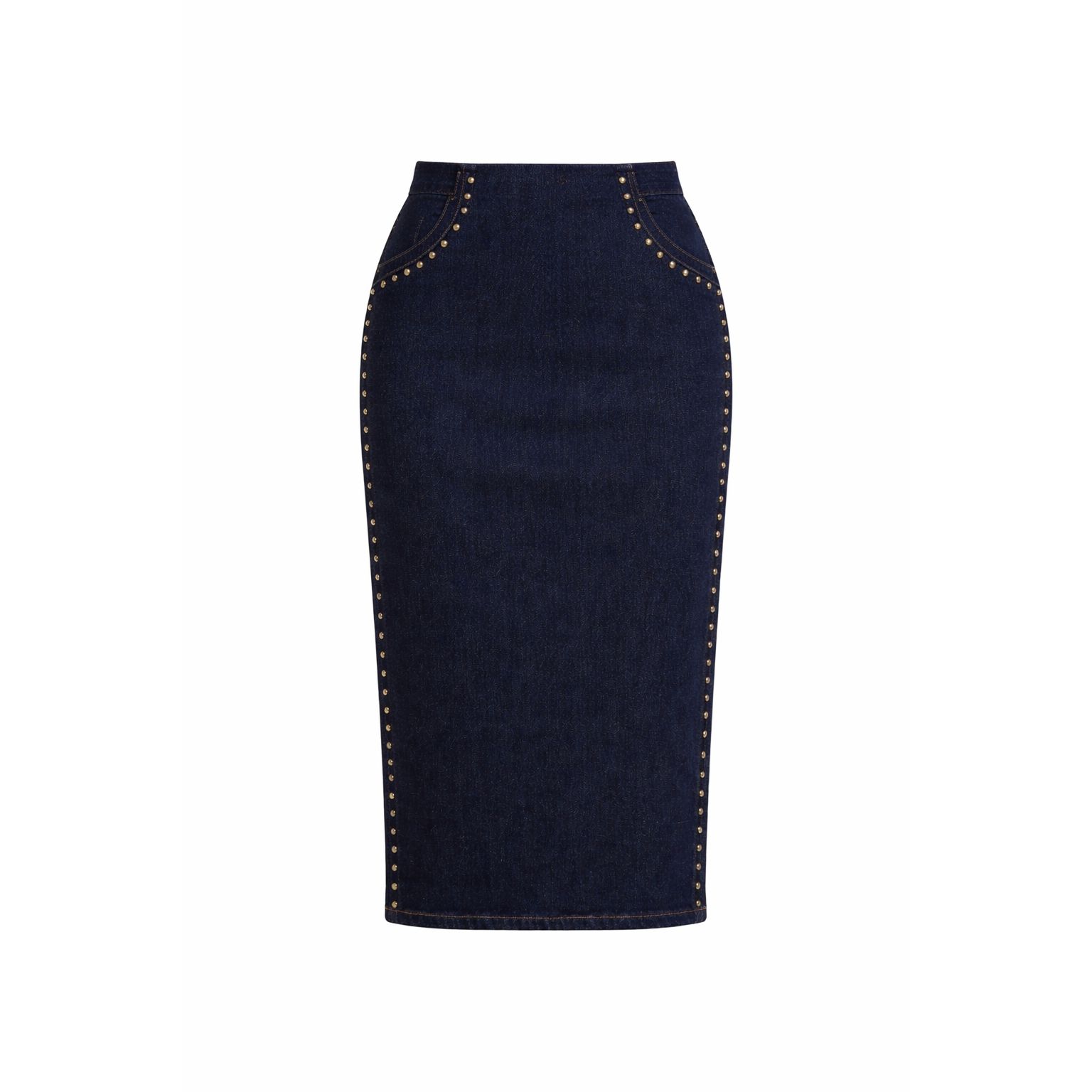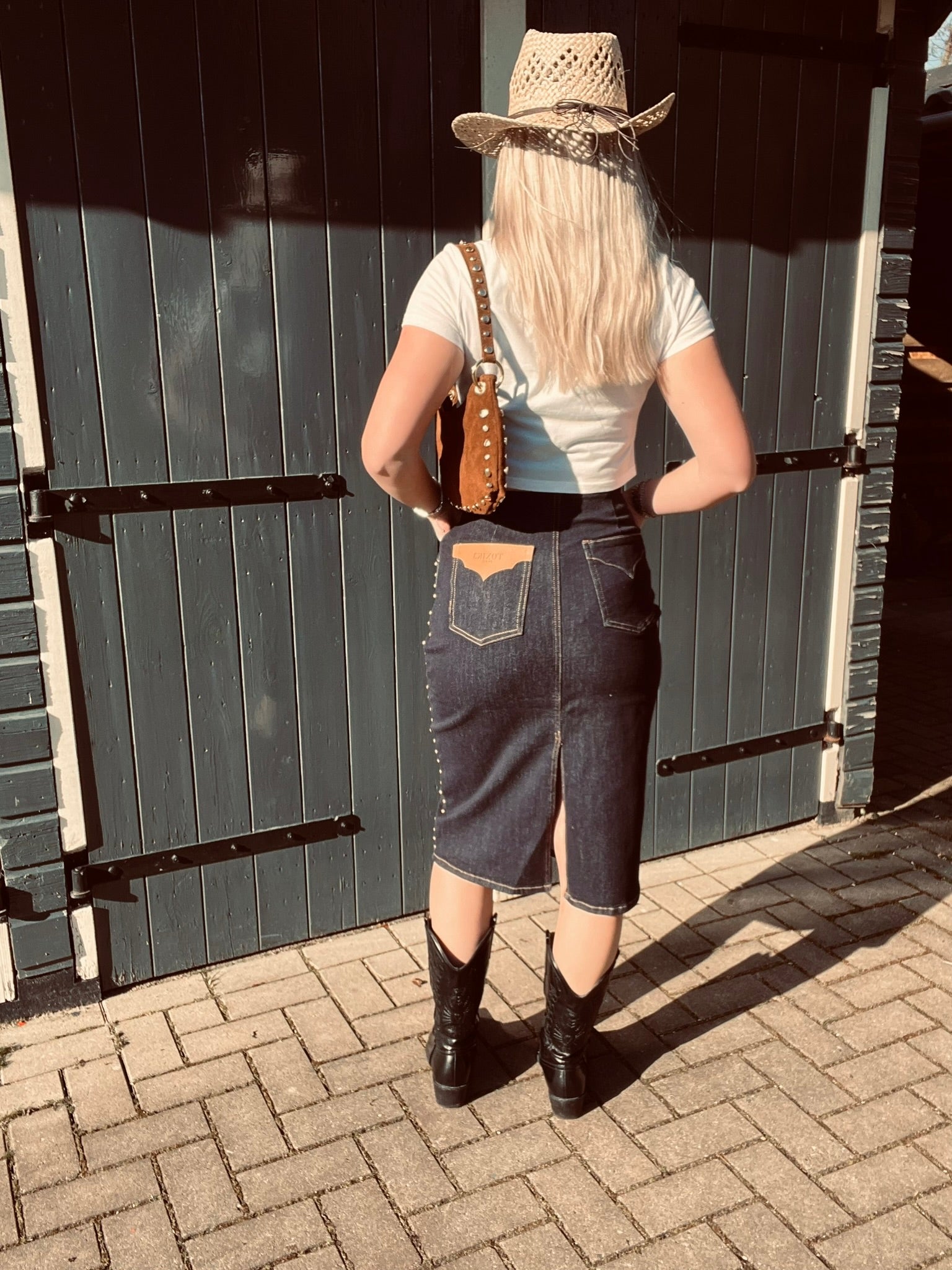 Deze rechte midi-rok met split combineert elegantie met een subtiele western uitstraling. De rok is gemaakt van stretch denim, waardoor hij comfortabel zit en mooi aansluit. De klinknageldetails geven het ontwerp een stoere, stijlvolle touch.